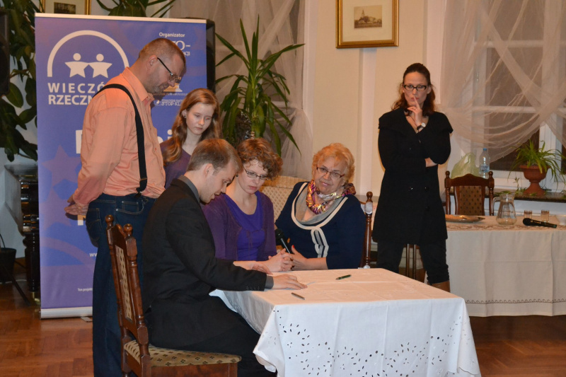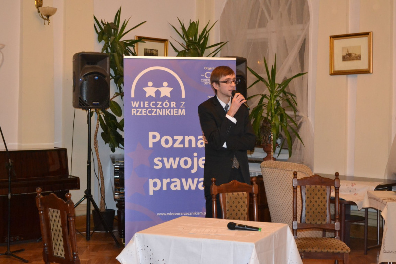 22 listopada o godz. 17.30 w Sali Kameralnej MCK w Lipnie odbyło się pierwsze w Polsce spotkanie w ramach projektu „Wieczór z Rzecznikiem”. Współorganizatorem spotkania była Miejska Biblioteka Publiczna w Lipnie. Tematem spotkania były prawa konsumenckie. W spotkaniu uczestniczyli: Zastępca Burmistrza Miasta Lipna - Dariusz Chmielewski, radni Rady Miejskiej w Lipnie oraz sympatycy i przyjaciele biblioteki. Dla uczestników przygotowano projekcję filmu dokumentalnego, pokazującego prawdziwą historię osoby, której prawa zostały naruszone. Stowarzyszenia Stop-Klatka przygotowało warsztaty teatralne przeprowadzone metodą dramy. Widzowie mogli wpływać na bieg rozgrywających się wydarzeń na scenie oraz proponować własne rozwiązania sytuacji. Odbyła się otwarta dyskusja z udziałem przedstawiciela Biura Rzecznika Praw Obywatelskich, którego reprezentował Pan Łukasz Kosiedowski. Wszyscy uczestnicy „Wieczoru z Rzecznikiem” otrzymali zestawy materiałów, które przybliżały kwestie związane z prawami podstawowymi oraz z działalnością Biura Rzecznika Praw Obywatelskich. W trakcie wieczoru odbyło się uroczyste podsumowanie i rozdanie nagród - konkurs plastyczny na najciekawszy plakat promujący prawa konsumenckie pt. „Mały konsument 2013” skierowany do uczniów kl. V- VI szkół podstawowych z terenu miasta Lipna i powiatu lipnowskiego. Centrum Edukacji Obywatelskiej pokryło koszty przygotowania cateringu w ramach spotkania. Bogactwo i różnorodność kuchni kujawskiej w całej krasie prezentowała Pani Mirosława Wilk, która jest pasjonatką gotowania. Prowadzi gospodarstwo agroturystyczne „Wilcza Chata” oraz lokal gastronomiczny „Tradycyjne jadło” w miejscowości Wielgie. Dzień ten upłynął wszystkim w serdecznej i przyjacielskiej atmosferze.