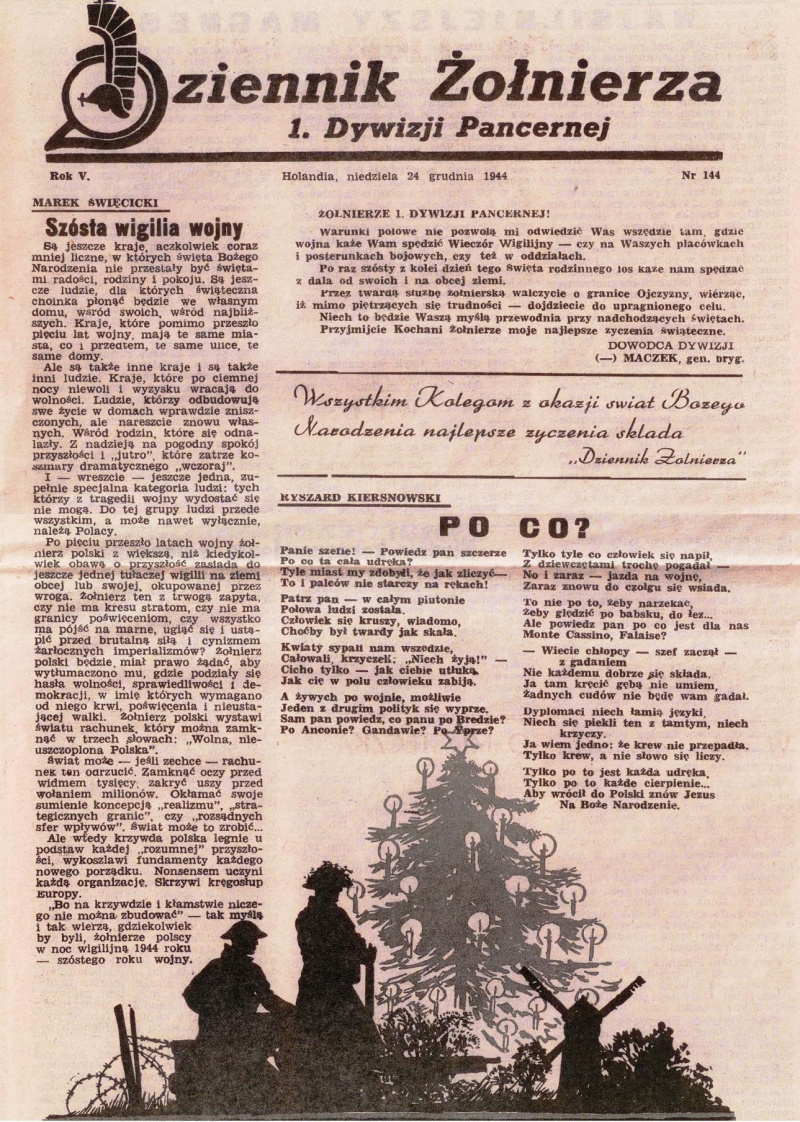 Udostępniamy Państwu jedno z czasopism wydane w Holandii pt. „Dziennik Żołnierza 1. Dywizji Pancernej” nr 144 z 24 grudnia 1944 roku, w którym generał Stanisław Maczek dowódca 1. Dywizji Pancernej nazywany „Bacą” składa życzenia przed Wigilią Bożego Narodzenia żołnierzom.