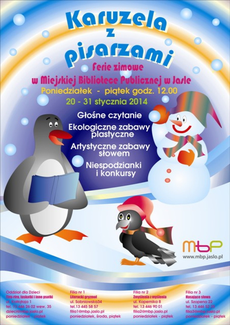 Lubicie zabawy na karuzeli? Chcecie zakręcić się na niej z Agnieszką Frączek, Dorotą Gellner, Małgorzatą Strzałkowską i Grzegorzem Kasdepke? Od 20 do 31 stycznia 2014 r. Miejska Biblioteka Publiczna zaprasza dzieci w wieku 5-11 do Oddziału dla Dzieci i filii bibliotecznych przy ul. Szopena 22, Kopernika 8 i Sobniowskiej 34 na ferie pod hasłem „Karuzela z pisarzami”. Codziennie o 12.00 będziemy wypełniać czas najmłodszych głośnym czytaniem i rozmaitymi formami zajęć.