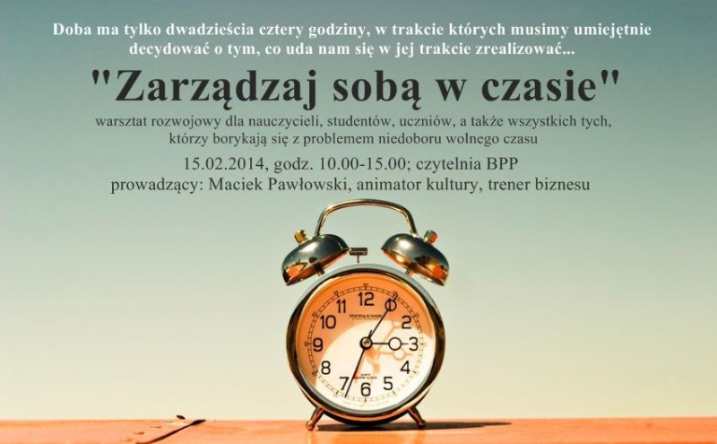 15.02.2014 r. o godz. 10:00 Biblioteka Pedagogiczna w Piotrkowie Trybunalskim zaprasza nauczycieli, studentów, uczniów, a także wszystkich tych, którzy borykają się z problemem niedoboru wolnego czasu na warsztat, prowadzony przez Macieja Pawłowskiego - animatora kultury i trenera biznesu: "Zarządzaj sobą w czasie". Na spotkaniu uczestnicy poznają proste i skuteczne narzędzia zwiększające efektywność osobistą w ciągu dnia. Sprawdzą, które zajęcia są naszymi "pożeraczami" wolnego czasu i jak skutecznie wyeliminować je ze swojej codzienności. Będą mieć okazję do ćwiczeń, zdobycia nowej wiedzy, refleksji i wymiany doświadczeń.