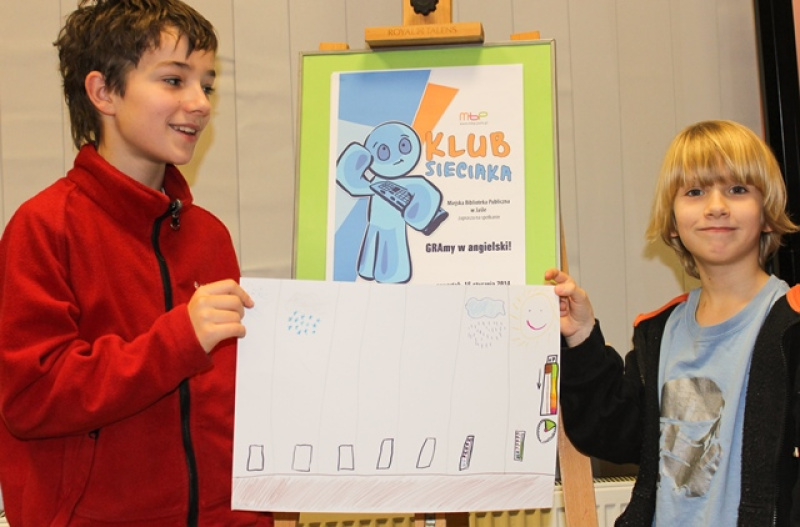i kolejnymi poziomami gry. Wpadłyśmy na pomysł, że bohaterem gry może być ludzik przypominający Sieciaka – powiedziały Kasia i Iza. My tworzymy misje, w której bohater idzie na spacer i musi przygotować się do wyjścia w zależności od pogody. Dzięki temu można poznawać słówka związane np. z pogodą i ubraniem – opowiadali o swoim projekcie Kuba i Tomek.