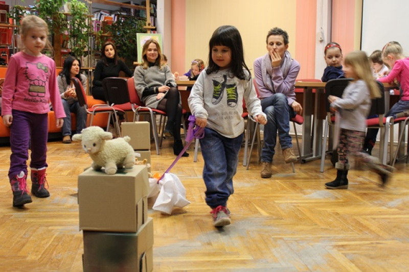 Rodzinne czytanie i projekcja filmów „kolęda-echo” pozwoliły przenieść się dorosłym i dzieciom w zimową scenerię, gdzie czekała na nich jazda na samodzielnie pomalowanych sankach. Dla każdego wystarczyło miejsca w kolorowym kuligu, odbył się też saneczkarski slalom z przeszkodami. Spotkanie zakończyło się wypowiedzianą przez wszystkie dzieci prośbą do Zimy, zaczerpniętą z wiersza H. Ożogowskiej: Droga Pani Zimo, sypnij dużo śniegu, żeby nam saneczki nie ustały w biegu!