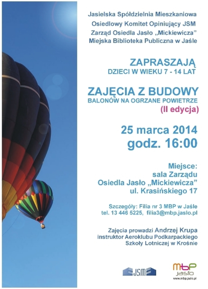 Miejska Biblioteka Publiczna w Jaśle, Jasielska Spółdzielnia Mieszkaniowa, Komitet Osiedlowy JSM oraz Zarząd Osiedla „Mickiewicza” zapraszają młodych fanów modelarstwa lotniczego na II edycję zajęć z budowy balonów na ogrzane powietrze.