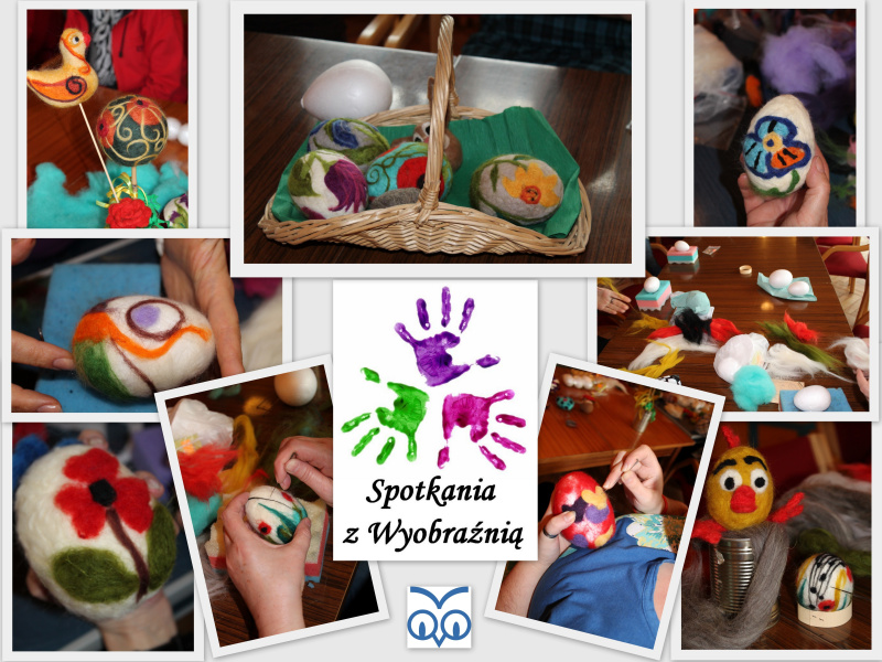 Kwietniowe warsztaty artystyczne z cyklu „Spotkania z Wyobraźnią”, mimo, że dotyczyły pisanek, były jednak dla wielu uczestniczek dość zaskakujące. Wszyscy wiemy, jak zdobi się wielkanocne jajka – można je zafarbować, odrapać, nawet okleić, a ostatnio modne są także inne techniki ich zdobienia, m.in. decoupage. Ale co można zrobić mając styropianowe jajko, dziwnie wyglądającą igłę oraz strzępy wełny czesankowej? A otóż można zrobić piękne i oryginalne pisanki (i nie tylko, bo również zajączki, kurczaki, baranki), filcowane na sucho, igłą. Prowadząca spotkanie pani Dorota przedstawiła uczestniczkom tylko podstawy techniki, zaś dalej prowadziła je ich własna wyobraźnia i talenty manualne. Efekty tych prac można podziwiać na zdjęciach, zaś w pamięci pozostanie mile spędzony wspólnie czas oraz nowo nabyte umiejętności, które być może zaowocują w przyszłości kolejnymi pięknymi, filcowanymi dziełami.