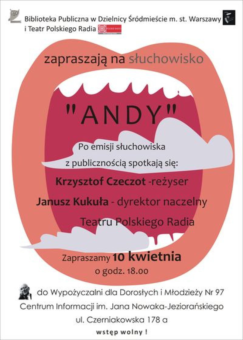 W najbliższy czwartek 10 kwietnia o godzinie 18:00 będzie możliwość spotkania z Krzysztofem Czeczotem- reżyserem słuchowiska „Andy” i Januszem Kukułą - dyrektorem Teatru Polskiego Radia. Po emisji słuchowiska zapraszamy do dyskusji.. Wydarzenie to odbędzie się w Centrum Informacji im. Jana Nowaka-Jeziorańskiego ul. Czerniakowska 178a. Wstęp wolny.