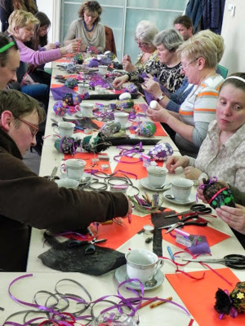 To już kolejne warsztaty rękodzielnicze dla dorosłych w naszej książnicy. Uczestnicy spotkania poznali technikę enkaustyczną, którą ozdabiali styropianowe jajka, z wykorzystaniem flizeliny, kolorowych tasiemek i aplikacji kwiatowych. Efektem końcowym wspólnej pracy były pisanki "na bogato". Mamy nadzieję, iż barwne, kolorowe jajka, zdobione woskiem z kredki świecowej przyozdobią koszyk i stół świąteczny uczestników warsztatów.