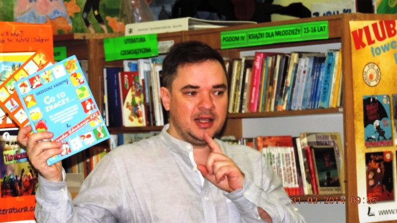 Swoje spotkanie pan Grzegorz Kasdepke rozpoczął od autoprezentacji. Przyjechał z Warszawy. Urodzony w 1972 r. w Białymstoku. Autor książek dla dzieci i młodzieży.