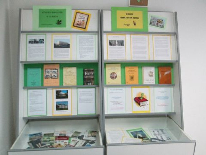 - Wystawa pt. „Tydzień Bibliotek i Dzień Bibliotekarza” – okolicznościowa wystawa, na której odnajdziemy informacje o Tygodniu Bibliotek i Dniu Bibliotekarza. Na ekspozycji znajdują się książki i czasopisma bibliotekarskie, fotografie i krótka charakterystyka najbardziej znanych polskich bibliotek, artykuły dotyczące zawodu bibliotekarza, a także bibliotekarskie dowcipy i humorystyczne obrazki. Wystawę można oglądać do końca maja.