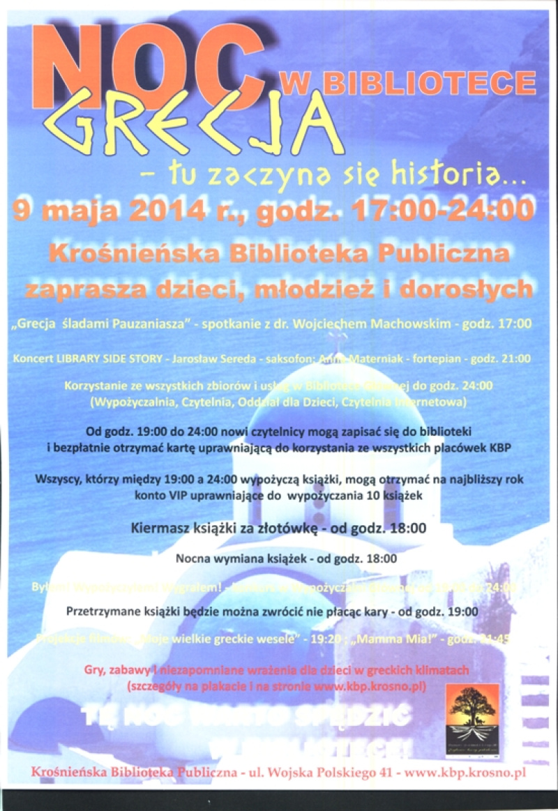 Pod hasłem „Grecja – tu zaczyna się historia…” dla mieszkańców przygotowano wiele propozycji, pokazujących biblioteką jako aktywną instytucję kultury, która oprócz udostępniania i informowania proponuje działania popularyzujące czytanie i bibliotekę w nieco nietypowych formach. O godz. 17.00 Grecję śladami Pauzaniasza zaprezentuje dr Wojciech Machowski – archeolog i podróżnik, wykładowca na Uniwersytecie Jagiellońskim. Od godz. 18.00 do 24.00 będzie można kupić książkę za złotówkę, a każdy kto chciałby zamienić swoje przeczytane książki na inne, może wziąć udział w nocnej wymianie książek. Wszyscy nowi czytelnicy, którzy chcieliby się zapisać do biblioteki od godz. 19.00 będą mogli to zrobić nie płacąc za kartę, natomiast wszyscy którzy w tym czasie przyjdą do biblioteki wypożyczyć książki, będą mogli otrzymać tzw. konto VIP uprawniające do jednorazowego wypożyczania przez najbliższy rok 10 książek.