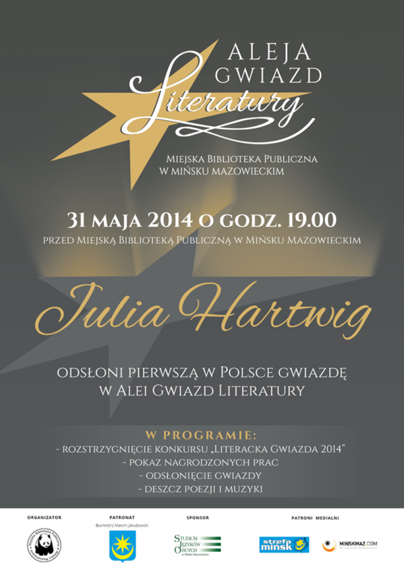 Miejska Biblioteka Publiczna w Mińsku Mazowieckim zaprasza na galę otwarcia Alei Gwiazd Literatury. W sobotę, 31 maja o godz. 19 pierwszą Gwiazdę odsłoni poetka, eseistka i tłumaczka literatury pięknej – Julia Hartwig.Aleja Gwiazd Literatury to projekt, którym jako instytucja kultury pragniemy promować twórczość najlepszych współczesnych pisarzy i poetów. Jest to także okazja, by zaprosić do naszego miasta wybitne osobistości świata literatury i wspólnie z mieszkańcami Mińska Mazowieckiego i naszymi Czytelnikami spędzić wyjątkowe chwile, obcując z mistrzami słowa.