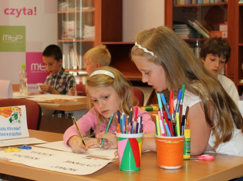 Dzieci w grupach tworzyły prace inspirowane hasłami „Czytanie – mądra rzecz!” oraz „Książka, która mówi? Czytanie w przyszłości!”. Wspólna praca była pełna dziecięcych emocji i dyskusji, a jej efekty – fantastyczne. Iza i Ania stworzyły pracę o bibliotece, w której wszystkie ksiązki czytają się same a Michał, Paweł i Michał plakat „CzitBot5 – czytanie w przyszłości”.