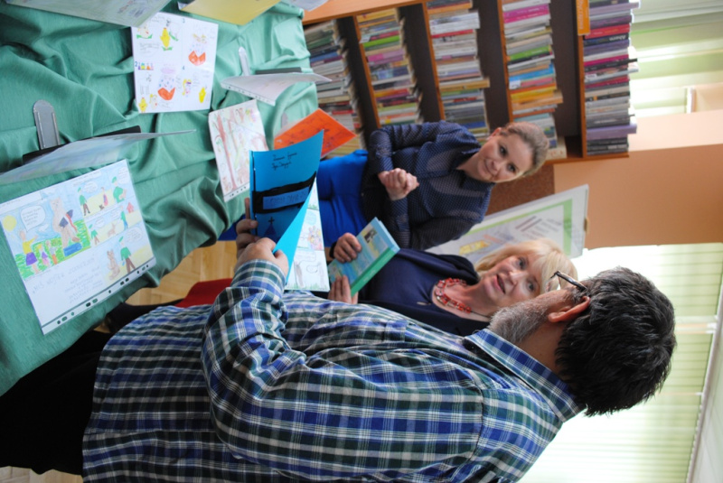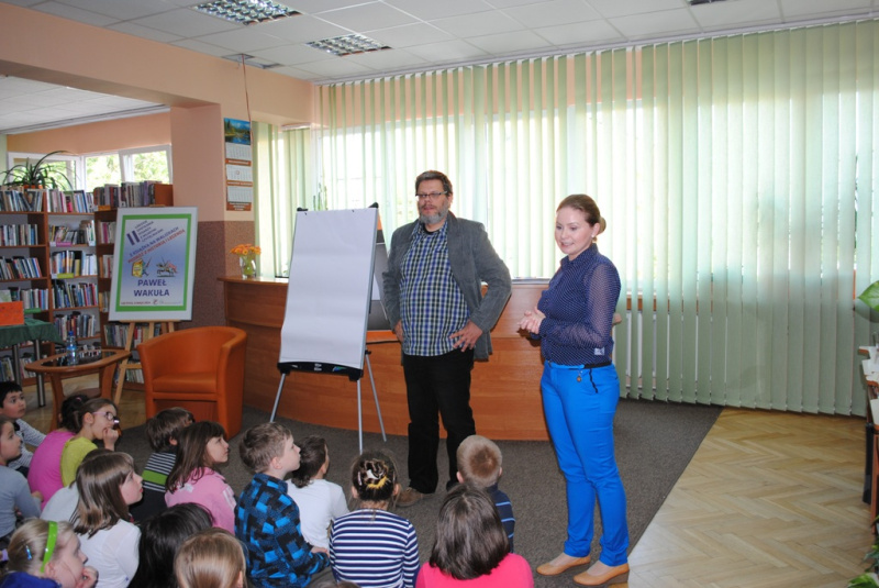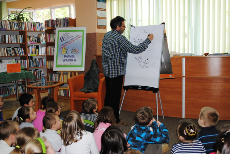 Pan Paweł Wakuła to absolwent malarstwa i pedagogiki artystycznej. Uprawia niepoważny -jak sam mówi, zawód rysownika-humorysty. Od lat związany jest z tygodnikiem „Angora” oraz popularnym dodatkiem dla dzieci – „Angorką”. W 2007 roku jego książka pt.: „Co w trawie piszczy” została wyróżniona w Konkursie Literackim im. Astrid Lindgren., natomiast książka pt.: „Kajtek i Yetik” została nominowana do Nagrody Literackiej im. Kornela Makuszyńskiego. Podczas spotkania autor opowiadał o kulisach pracy rysownika, o własnych książkach i historiach ich powstania jednocześnie rysując bohaterów swoich opowieści za pomocą jednego ze swych ulubionych narzędzi – pisaka. W swoje opowiadania wplatał ponadto legend y a także gawędy o chochlikach, nimfach, leśnych lichach, żabonach, rusałkach i innych stworkach występujących w jego książkach. W trakcie spotkania zaproszony autor rozstrzygnął również konkurs plastyczno-literacki „A to historia” zorganizowany przez Wydawnictwo Literatura . Wszystkie dzieci, które wzięły udział w konkursie otrzymały dyplomy, zwycięzcy książkę Pana Wakuły.