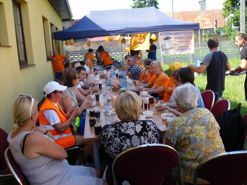 Wyruszyliśmy grupami z poszczególnych miejscowości tj. Bieniów, Lubanice, Złotnik, Żary, Mirostowice Dolne, Sieniawa Żarska oraz Olbrachtów. Cel był jeden - dotrzeć do Bieniowa. Bardzo ruchliwą trasą eskortowała nas policja i straż pożarna. Do Bieniowa na piknik dojechała kolumna, która liczyła około 30 rowerzystów. Na miejscu organizatorzy orzeźwili nas napojami oraz zadbali o nasze podniebienia. Poczęstunek był wyśmienity. Po jedzeniu przyszedł czas na część oficjalną i zabawy. Pani dyrektor powitała wszystkich "rajdowców" a także gości. Wśród nich był m.in. Wójt Gminy Żary - Wiesław Polit oraz Pani Helena Mużyłowska, która pracowała w naszej Bibliotece. Po części oficjalnej przyszedł czas na zabawy, sprawdzaliśmy jak uczestnicy pamiętają wiersze z dzieciństwa oraz jak radzą sobie z tworzeniem budowli z książek. Dla zwycięzców przewidziano nagrody, a każdy uczestnik wyjechał z pamiątką.