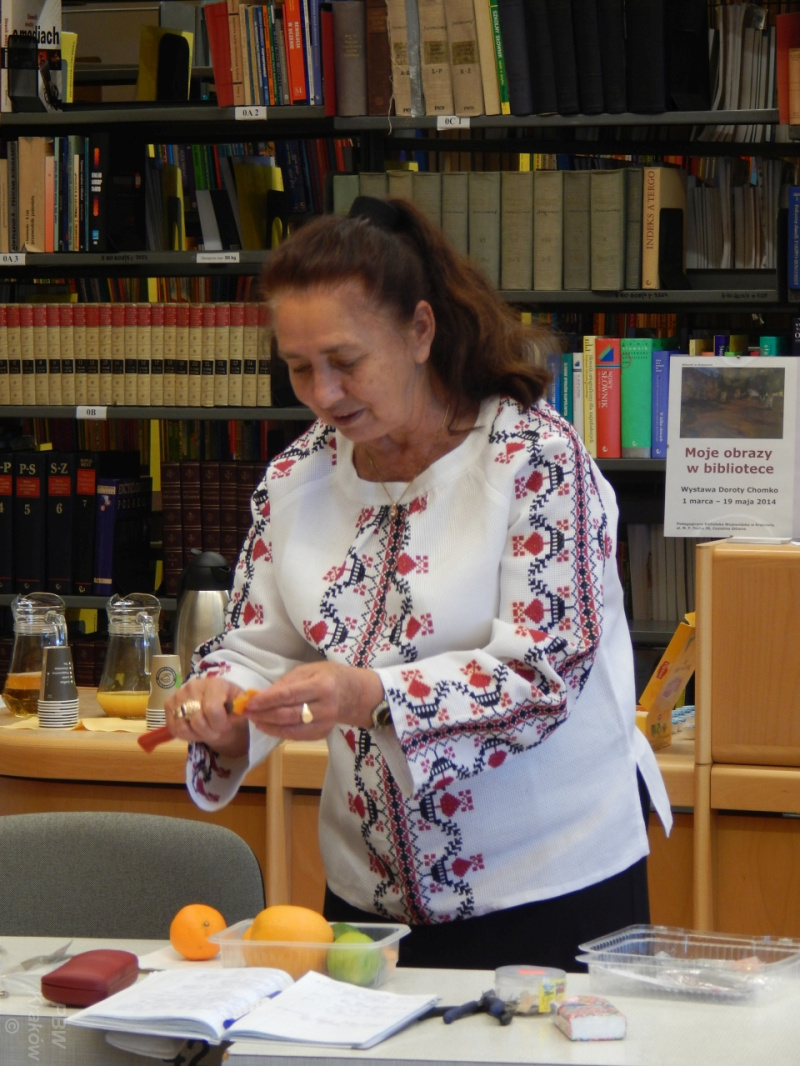 Pani Zofia Stanisz-Zoń pokazała "na żywo" jak ze zwykłych zamków błyskawicznych lub skórek pomarańczy można "wyczarować" urokliwą biżuterię. Pani Mirosława Czerniak oprócz opowieści o tym jak się "maluje obrazy igłą" ujawniła nam swoją drugą pasję – tworzenie poezji i to wprost "na zawołanie". Pani Aleksandra Antoń zdradziła tajniki tworzenia ozdób na szydełku – od niewielkich rozmiarami gadżetów kuchennych do ... firanek. Pani Janina Kłeczek opowiedziała jak wciągająca może być sztuka haftowania i jak przy okazji kształtuje się cierpliwość. Końcowym akcentem była prezentacja prac Pani Marii Kot, która specjalizuje się w ozdabianiu przedmiotów techniką dekupażu.