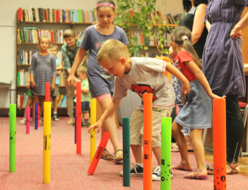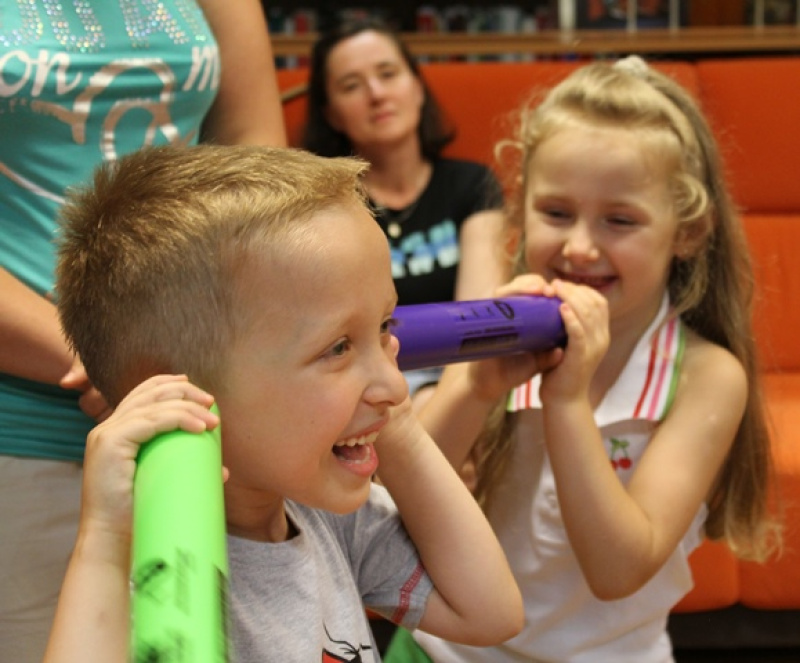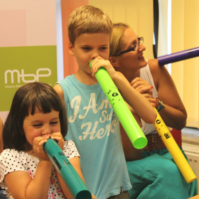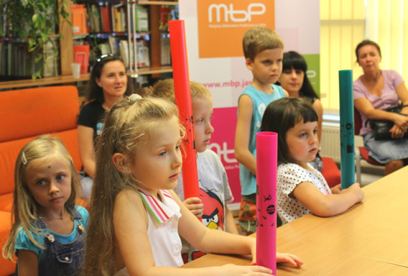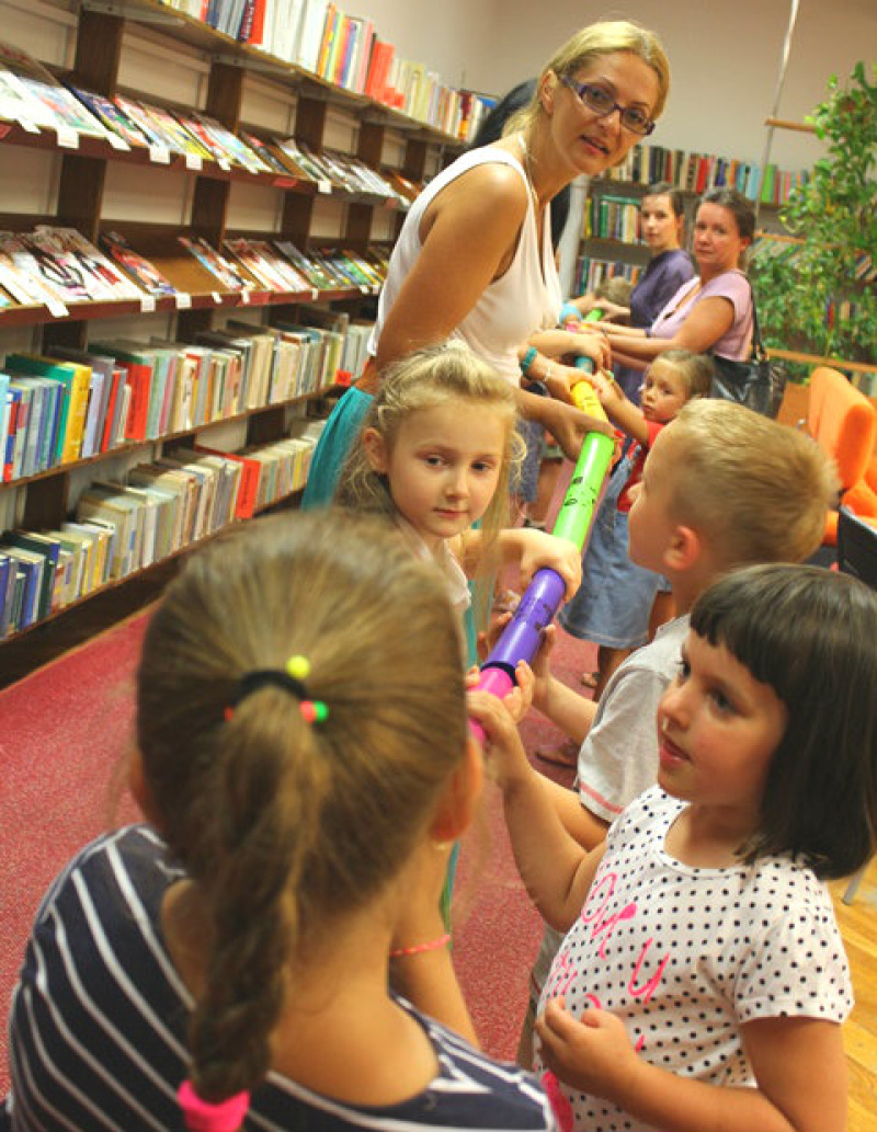 Dzieci wysłuchały głośnego czytania wiersza o pewnej Basi i gamie. W bibliotece kolorowo zadudniło i zatrąbiło. A wszystko za przyczyną małych instrumentalistów, którzy dzięki akustycznym rurkom mogli wygrywać dźwięki, rytm i melodię ulubionych piosenek. Do biblioteki przyjechał pędzący z daleka pociąg, a Pan Jan wreszcie mógł się zbudzić. Graniu i śpiewaniu nie byłoby końca, gdyby nie okazało się, że magiczne rurki posłużyć mogą także za telefon, muszlę morską czy doskonały tor przeszkód. Tak zakończyły się nasze eksperymenty z dźwiękiem i kolorami oraz rodzinne i solowe popisy muzyczne Klubowiczów.
