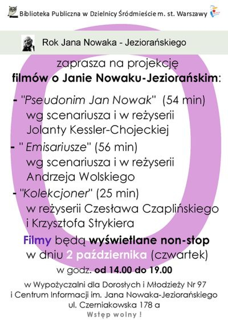 Wypożyczalnia dla Dorosłych i Młodzieży nr 97 zaprasza 2 października (czwartek) 2014 r. od godz. 14.00 do 19.00 do Centrum Informacji im. Jana Nowaka Jeziorańskiego przy ulicy Czerniakowskiej 178 A na projekcję filmów o Janie Nowaku-Jeziorańskim: