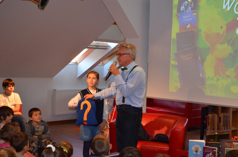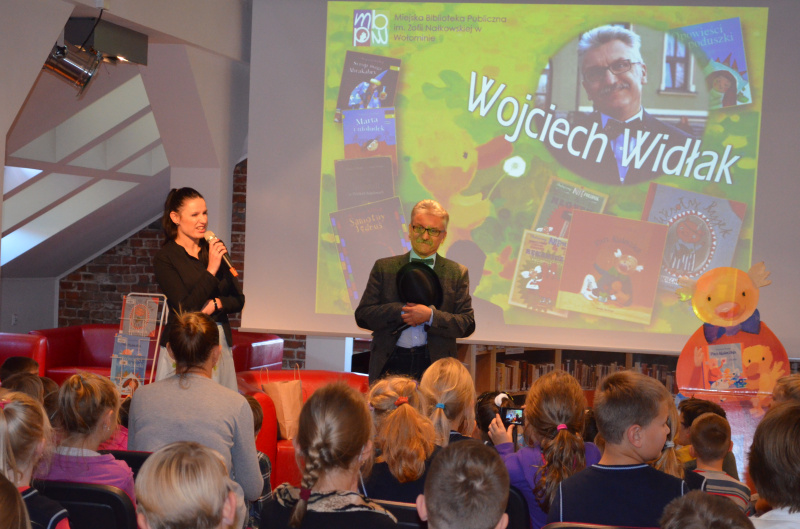 Gościliśmy bowiem niezwykłego pisarza, Wojciecha Widłaka, którego książki osiągają szczyty popularności. Ten wielokrotnie nagradzany autor oraz redaktor poczytnego magazynu dla rodziców, przybył do wołomińskiej biblioteki aby spędzić niemal dwie godziny w gronie swoich najwierniejszych fanów. Opowiadał on o postaciach ze swojej najpopularniejszej serii książek o przygodach Pana Kuleczki.