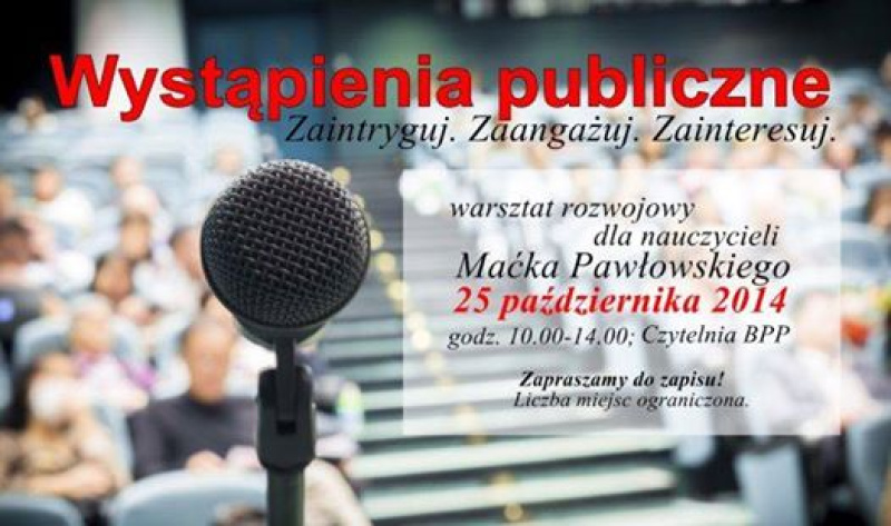 25.10.2014 r. o godz. 10.00 Biblioteka Pedagogiczna w Piotrkowie Trybunalskim zaprasza nauczycieli na warsztat rozwojowy - Wystąpienia publiczne. Spotkanie poprowadzi Maciek Pawłowski - animator kultury i trener biznesu, który zdradzi kilka sposobów na podniesienie atrakcyjności wystąpień, a biblioteka przygotuje fachową literaturę, która wzbogaci zdobytą wiedzę.