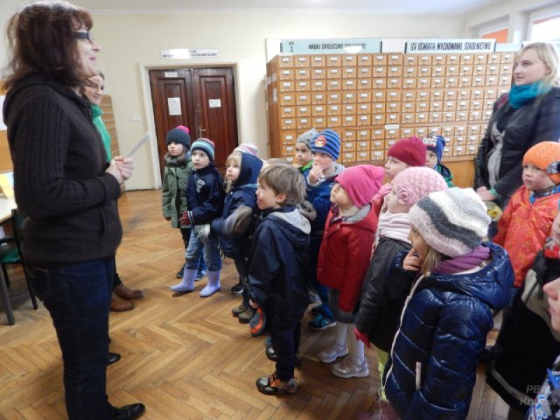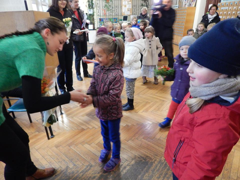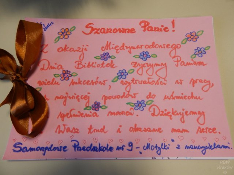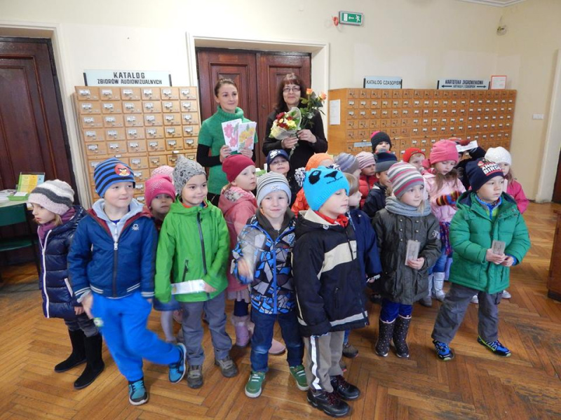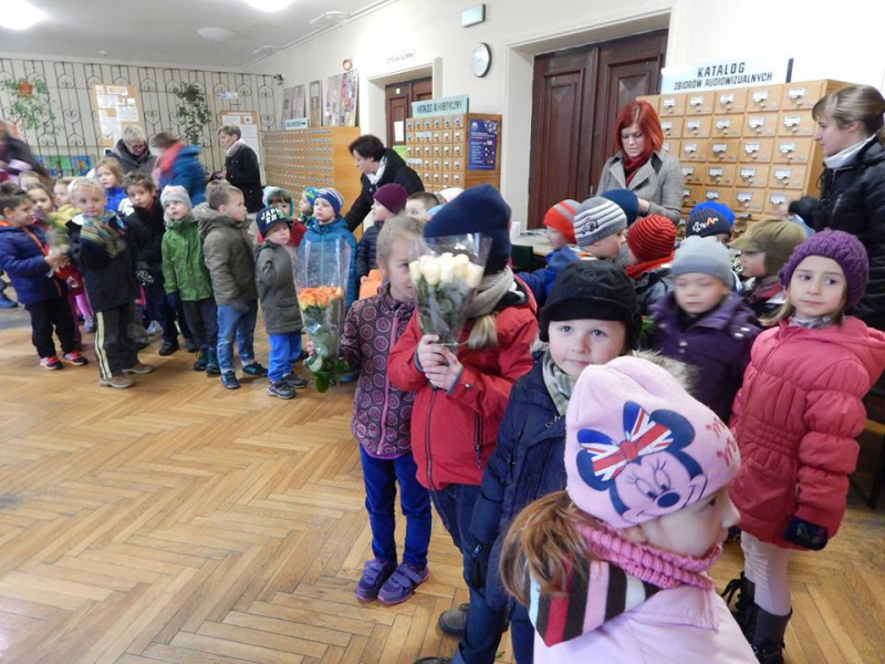 Dzieci przybyły do biblioteki, by w tym szczególnym dniu złożyć życzenia bibliotekarzom i... bibliotece, wręczyć piękne bukiety kwiatów, laurki i własnoręcznie wykonaną pamiątkową książkę z autorskimi ilustracjami przedszkolaków. Odśpiewały "100 lat" oraz wspólnie z nauczycielkami podziękowały za wszystkie miłe chwile spędzone w bibliotece podczas warsztatów i zajęć, w których uczestniczyły.