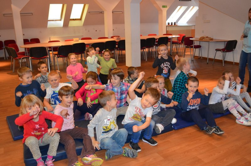 Tegoroczny październik upłynął odwiedzającym wołomińską bibliotekę przedszkolakom na spotkaniu z Wesołym Ryjkiem, bohaterem uwielbianej przez dzieci serii książeczek autorstwa, goszczącego niedawno w bibliotece, Wojciecha Widłaka. Wesoły Ryjek to rezolutna świnka, ciekawa świata, która codziennie przeżywa niesamowite przygody. Zajęcia rozpoczęliśmy od rozmowy z dziećmi, które opisywały znane im świnki. Wspólnie obejrzeliśmy również prezentację multimedialną przedstawiającą – bohaterów książek i filmów dla dzieci, oczywiście tych z ryjkiem. Nie mogło zabraknąć głośnego czytania opowiadań o przygodach Wesołego Ryjka. Dzieci uczestniczyły w zabawach ruchowych, sprawdzających i rozwijających ich koncentrację, spostrzegawczość oraz koordynację. Na zakończenie przedszkolaki wykonały pamiątkowe rysunki świnek i wykorzystując jesienny okres i wielokolorowe, spadające z drzew liście, przyozdobiły nimi swoje dzieła.