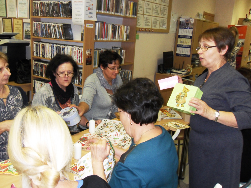 "Z partnerem raźniej - czy biblioteka gminna to partner, o którego warto zabiegać" to tytuł wizyty studyjnej, która odbyła się 22 października w Gminnej Bibliotece Publicznej w Lubiczu. Przybyli na nią bibliotekarze z bibliotek gminnych i powiatowych z Golubia Dobrzynia, Wielgiego, Chełmży, Dobrzejewic i Czernikowa. Na spotkaniu gościliśmy również panią Teresę Gryciuk Sekretarz gminy Lubicz, panią Katarzynę Rapior- Murawską ze Stowarzyszenia Bibliotekarzy Polskich oraz pana Andrzeja Pabiana, prezesa Fundacji Ośrodka Inicjatyw Społecznych ANRO ze Złotorii. Wizyta odbyła się w ramach programu grantowego "Wizyta za jeden uśmiech. Przyjedź, zobacz, działaj". Program był organizowany przez Stowarzyszenie Bibliotekarzy Polskich w ramach Programu Rozwoju Bibliotek, którego realizatorem jest Fundacja Rozwoju Społeczeństwa Informacyjnego. Głównym celem wizyty była promocja partnerstwa z lokalnymi instytucjami, promocja biblioteki jako miejsca dla szczególnej grupy użytkowników 60+, w którym mogą pożytecznie i twórczo spędzić czas, a w przyszłości stanowić grupę wsparcia dla biblioteki. Prezes FOIS ANRO podczas swojego wystąpienia przekonał uczestników, że biblioteka gminna to partner, o którego warto zabiegać, korzystać z jej zasobów i pozycji w lokalnym środowisku. W prezentacji multimedialnej pokazaliśmy zdjęcia z przebiegu projektu Intrdyscyplinaria dla seniorów 60+, w którym nasza biblioteka występowała w roli partnera Fundacji, a głównym zadaniem była organizacja warsztatów rękodzieła i promocja projektu w lokalnym środowisku. Każdy z uczestników wizyty miał możliwość wypowiedzenia się na temat swojej działalności związanej z pracą z seniorami, a także z dziećmi i młodzieżą. W drugiej części spotkania zaprosiliśmy uczestniczki na warsztaty decoupage, które poprowadziła pani Eugenia Kowalska, lokalna animatorka i Przyjaciel biblioteki. Wizyta była świetną okazją do wymiany doświadczeń i dzielenia się dobrymi praktykami, warto podkreślić też, że takie spotkania doskonale integrują środowisko zawodowe bibliotekarzy. Bardzo dziękujemy wszystkim uczestnikom za stworzenie dobrej i twórczej atmosfery, miłe słowa i życzliwość.