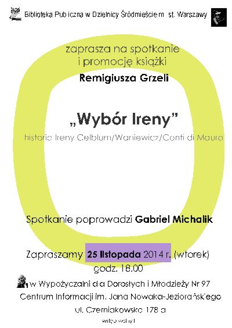 Biblioteka Publiczna w Dzielnicy Śródmieście m. st. Warszawy Wypożyczalnia dla Dorosłych i Młodzieży nr 97 zaprasza 25 listopada (wtorek) 2014 r. o godz. 18.00 do Centrum Informacji im. Jana Nowaka-Jeziorańskiego przy ulicy Czerniakowskiej 178 A na spotkanie i promocję książki Remigiusza Grzeli pt. „Wybór Ireny” - historia Ireny Celblum/Waniewicz/Conti di Mauro.
