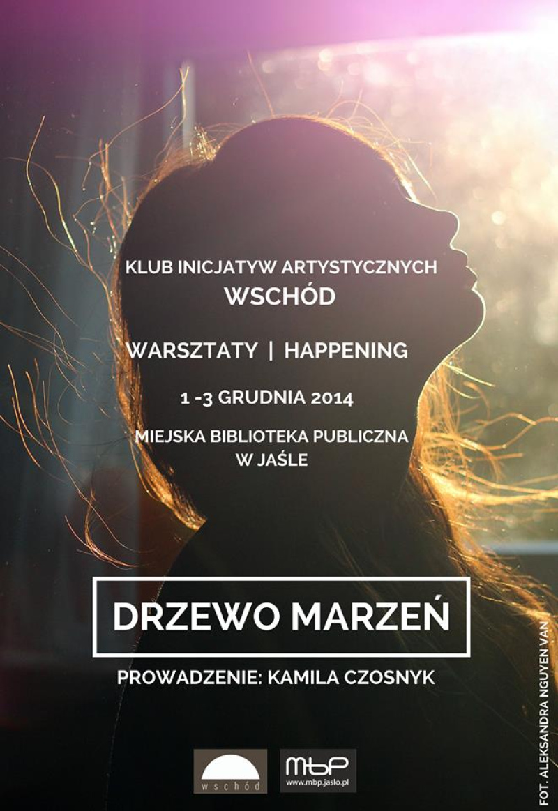Koniec roku to dobra pora, by sprawdzić jakie marzenia mają przechodnie na ulicy. To również dobra pora, by ożywić jesienną szarość sztuką i aktywnością. Uczestnicy warsztatów dowiedzą się, po co w ogóle sztuka w przestrzeni miejskiej, jak działa obiekt w przestrzeni, spróbują też sami stworzyć własne drzewo marzeń zebranych na ulicach Jasła. Warsztaty poprowadzi Kamila Czosnyk – artystka malarka, performerka, absolwentka Kolegium Sztuk Pięknych UMCS w Kazimierzu oraz kierunku malarstwo na Wydziale Artystycznym UMCS w Lublinie. Założycielka artystycznego kolektywu CrossRoad (https://www.facebook.com/crossroad.poland) z którym realizowała projekty w przestrzeni miejskiej w ramach lubelskiej Nocy Kultury 2014, współtwórczyni Autonomicznego Centrum Społecznego Cicha 4 (https://www.facebook.com/cicha4). Gościła na wielu wystawach zbiorowych i indywidualnych, m.in.: Labirynty (metafizyczne) w ramach Młode Forum Sztuki Galerii Białej, Lublin 2013.