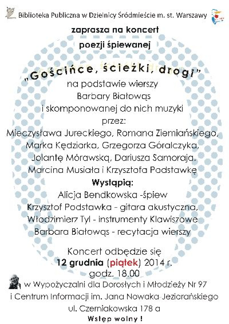 12 grudnia (piątek) 2014 r. o godz. 18.00 w Centrum Informacji im. Jana Nowaka-Jeziorańskiego przy ulicy Czerniakowskiej 178a wystąpią: Alicja Bendkowska - śpiew, Krzysztof Podstawka - gitara akustyczna, Włodzimierz Tyl - instrumenty klawiszowe, Barbara Białowąs - recytacja wierszy.