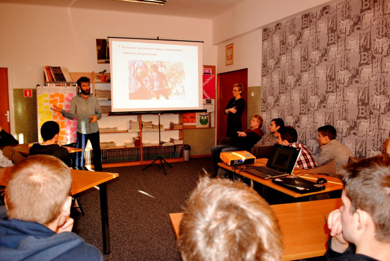 Gościem spotkania był Jan Wiesław Caban, dwudziestodziewięcioletni właściciel firmy zajmującej się marketingiem, copywritingiem i reklamą niestandardową. W rozmowie z tym młodym, inspirującym profesjonalistą, poznali jego drogę do sukcesu jakim jest własna firma. Poznali także zawody, na które prognozowane jest zapotrzebowanie w przyszłości oraz wzięli udział w quizie, który umożliwi im zorientowanie się w aktualnej sytuacji i trendach na rynku pracy. W spotkaniu wzięły udział dwie klasy w sumie liczące 41 osób.