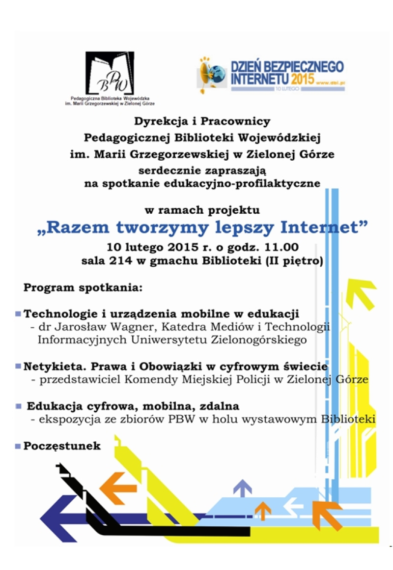 Dyrekcja i Pracownicy Pedagogicznej Biblioteki Wojewódzkiej im. Marii Grzegorzewskiej w Zielonej Górze serdecznie zapraszają na spotkanie edukacyjno-profilaktyczne w ramach projektu „Razem tworzymy lepszy Internet", które odbędzie się 10 lutego 2015 r. o godz. 11.00 w sali 214 w gmachu Biblioteki (II piętro).