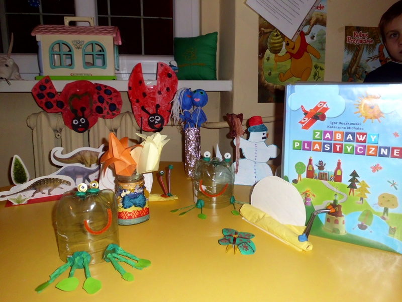 Lekcja biblioteczna miała swój ciąg dalszy… Zmierzono się z książką Igora Buszkowskiego „Zabawy plastyczne”. Przy wykorzystaniu surowców wtórnych powstały ciekawe dzieła.