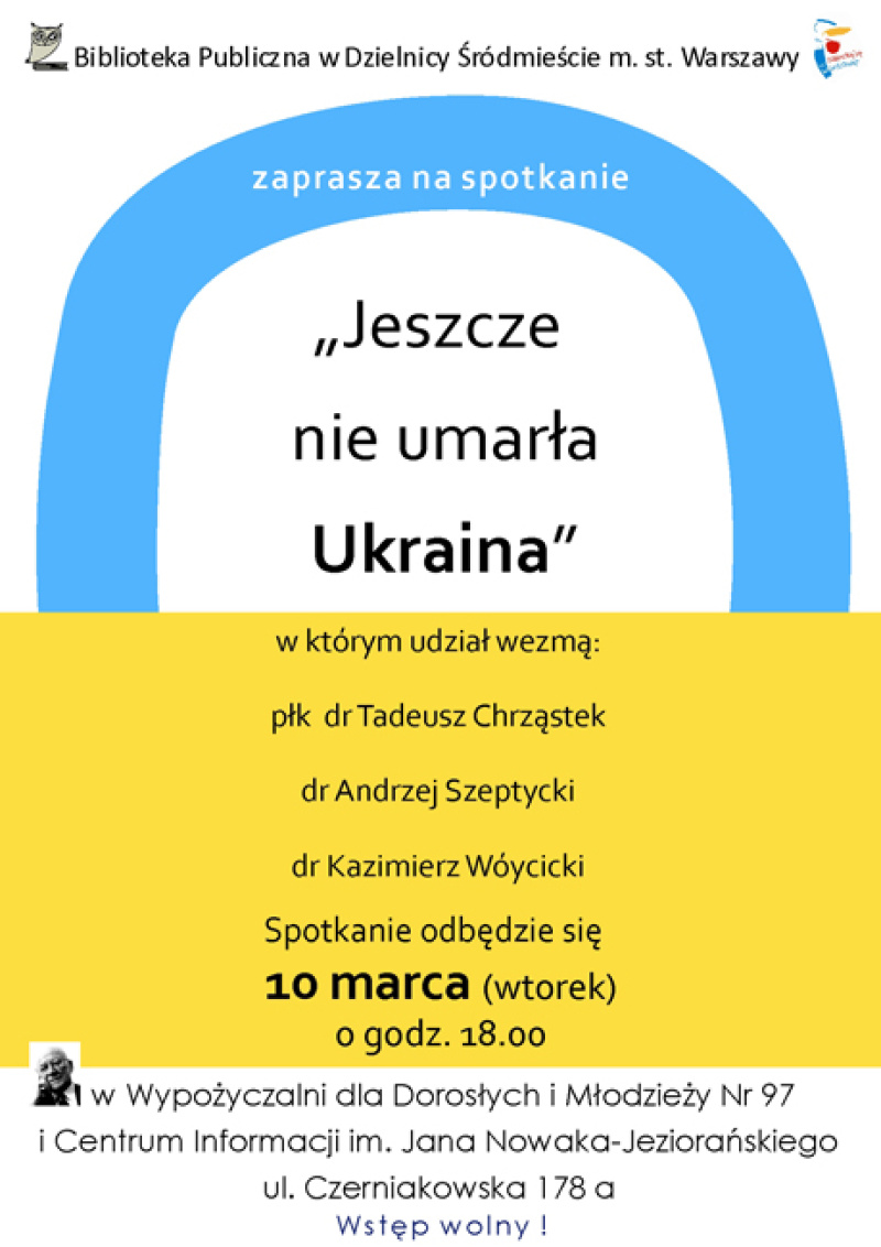 na spotkanie pt. "Jeszcze nie umarła Ukraina", w którym udział wezmą płk dr Tadeusz Chrząstek, dr Andrzej Szeptycki oraz dr Kazimierz Wóycicki