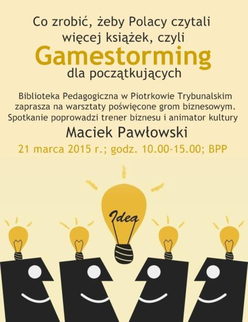21.03.2015 r. o godz. 10.00 Biblioteka Pedagogiczna we współpracy z Maćkiem Pawłowskim - trenerem biznesu i animatorem kultury zaprasza wszystkich na cykl warsztatów poświęconych gamestormingowi, czyli grom biznesowym nastawionym na przełamywanie barier i wyzwalanie kreatywności.