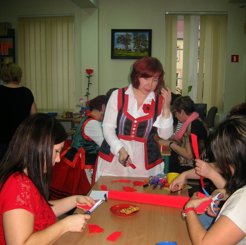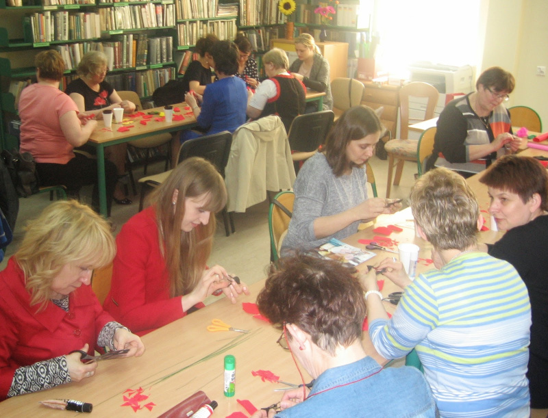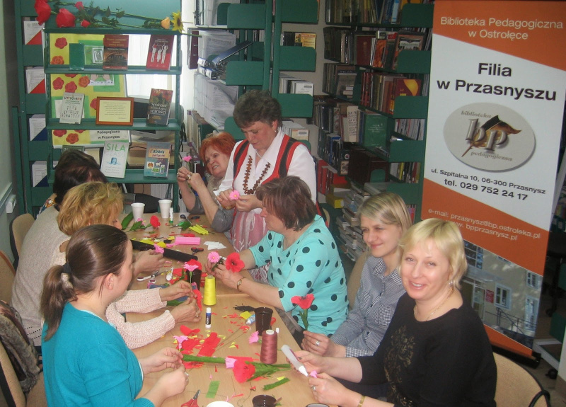 28 i 29 kwietnia w Bibliotece Pedagogicznej w Przasnyszu odbyły się warsztaty dla nauczycieli "Na kwietnej łące". Zajęcia przeprowadziły twórczynie z Kurpiowskiego Koła Biblioteki przy Miejsko-Gminnej Bibliotece Publicznej w Chorzelach - Filia Zaręby i Krukowo, które zaprezentowały się w strojach regionalnych. Nauczycieli uczyli się tworzenia kwiatów z krepiny: maków, chabrów i stokrotek. Zapraszamy do obejrzenia relacji na blogu SKARBY BIBLIOTEKI: