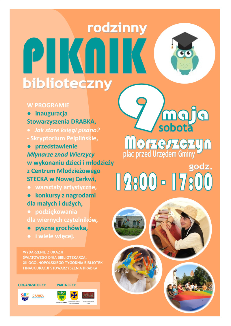 Dyrektor Gminnej Biblioteki Publicznej w Morzeszczynie i Zarząd Stowarzyszenia DRABKA zapraszają wszystkich na RODZINNY PIKNIK BIBLIOTECZNY, który odbędzie się 9 maja br. (sobota) na placu przed morzeszczyńskim Urzędem Gminy. Okazją dla tego wydarzenia jest obchodzony 8 maja Światowy Dzień Bibliotekarza, rozpoczynający się wkrótce XII Ogólnopolski Tydzień Bibliotek oraz inauguracja lokalnego Stowarzyszenia DRABKA.