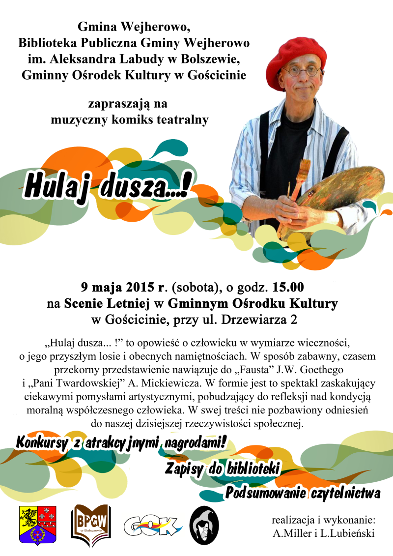 Godz. 10.00 – Zapisy do biblioteki – Filia nr 3 w Gminnym Ośrodku Kultury w Gościcinie ul. Drzewiarza 2: sala nr 210, I piętro; godz. 15.00 – muzyczny komiks teatralny „Hulaj dusza…!” – Scena Letnia – Gminny Ośrodek Kultury Gościcino. Konkursy rodzinne z atrakcyjnymi nagrodami. Wybieramy najaktywniejszych czytelników. Podsumowanie czytelnictwa za 2014 r. Rozwiązanie plebiscytu „Wybieramy książkę roku 2014”. Wręczenie nagród.