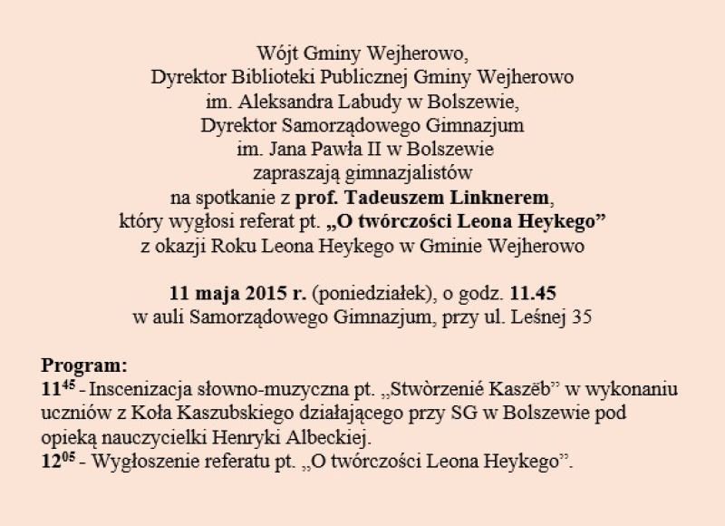Godz. 11.45 – „Stwòrzenié Kaszëb” – inscenizacja słowno-muzyczna w wykonaniu uczniów z Koła Kaszubskiego przy Samorządowym Gimnazjum w Bolszewie, (aula SG) ul. Leśna 35,godz. 12.05 – „O twórczości Leona Heykego” – referat wygłosi prof. Tadeusz Linkner, (aula SG). Godz 15.00-18.00 zajęcia pod hasłem „Na naukę języka angielskiego nigdy nie jest za późno!” dla osób 50+ dla trzech grup – Bolszewo, ul. Leśna 35.