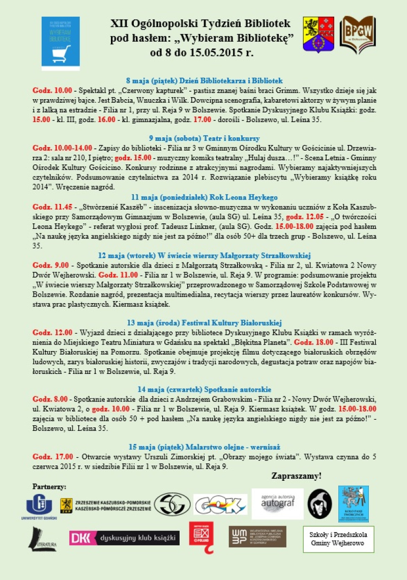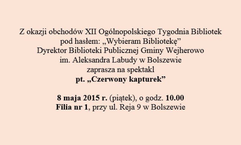 Godz. 10.00 – Spektakl pt. „Czerwony kapturek” – pastisz znanej baśni braci Grimm. Wszystko dzieje się jak w prawdziwej bajce. Jest Babcia, Wnuczka i Wilk. Dowcipna scenografia, kabaretowi aktorzy w żywym planie i z lalką na estradzie – Filia nr 1, przy ul. Reja 9 w Bolszewie. Spotkanie Dyskusyjnego Klubu Książki: godz. 15.00 – kl. III, godz. 16.00 – kl. gimnazjalna, godz. 17.00 – dorośli – Bolszewo, ul. Leśna 35.