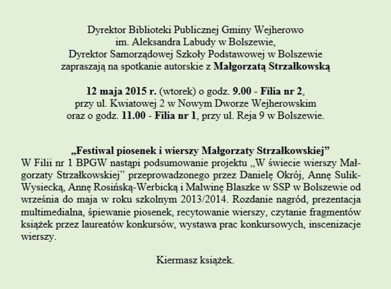Godz. 9.00 – Spotkanie autorskie dla dzieci z Małgorzatą Strzałkowską – Filia nr 2, ul. Kwiatowa 2 Nowy Dwór Wejherowski. Godz. 11.00 – Filia nr 1 w Bolszewie, ul. Reja 9. W programie: podsumowanie projektu „W świecie wierszy Małgorzaty Strzałkowskiej” przeprowadzonego w Samorządowej Szkole Podstawowej w Bolszewie. Rozdanie nagród, prezentacja multimedialna, recytacja wierszy przez laureatów konkursów. Wystawa prac plastycznych. Kiermasz książek.