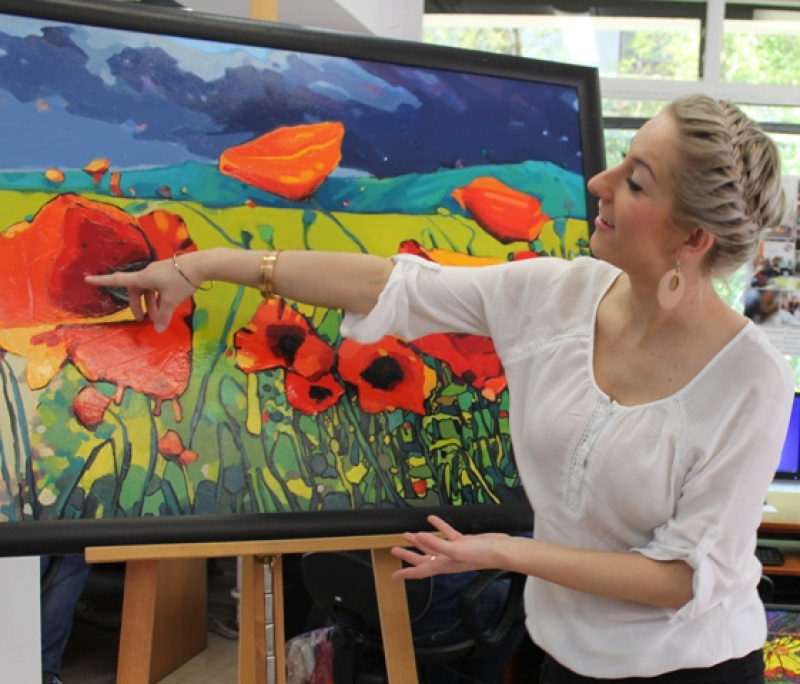 Bohaterami jej obrazów są głównie kwiaty. Czyste płótno jest zagadką i tajemnicą, a jego duży format ma swoje uzasadnienie. Duszę się w małym formacie - powiedziała na spotkaniu. Kwiaty będą towarzyszyć mi zawsze, jednak jestem ciekawa kolejnego etapu i nowych eksperymentów – dodała.