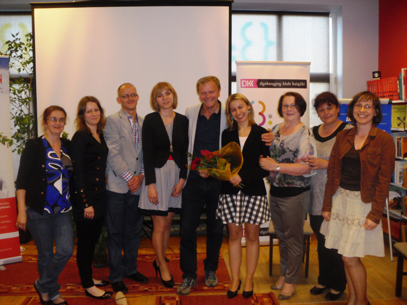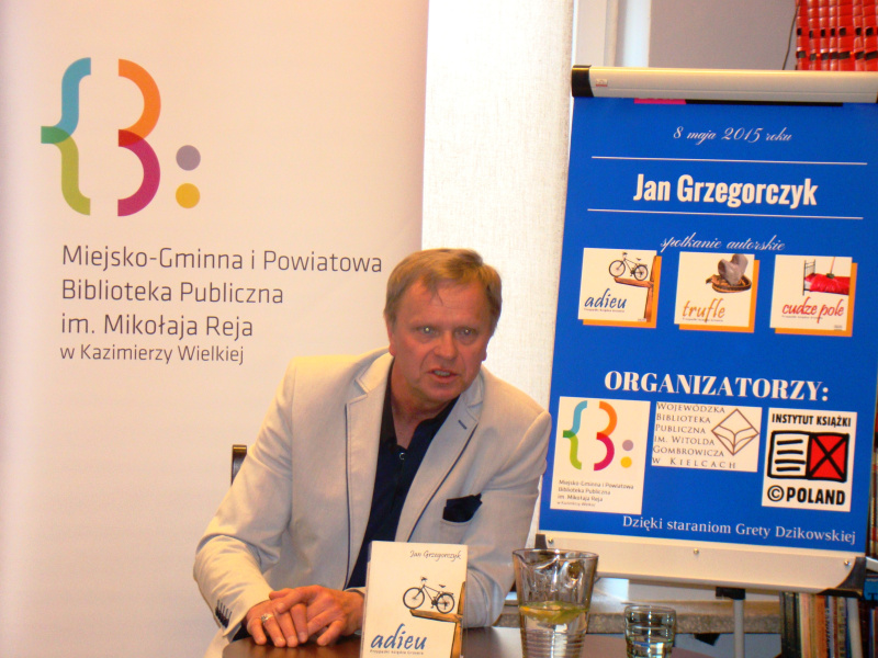 z Janem Grzegorczykiem. Od 2012 roku o możliwość zorganizowania spotkania z pisarzem niezmiennie zabiegała Greta Dzikowska, jedna z bibliotekarek pracujących w naszej bibliotece, która dba o to, aby książki Jana Grzegorczyka wzbogacały nasze zbiory zaraz po ukazaniu się na rynku wydawniczym. W 2014 roku rozpoczęliśmy starania o zorganizowanie takiego spotkania, w staraniach tych wsparła nas Wojewódzka Biblioteka Publiczna im. Witolda Gombrowicza w Kielcach, która postanowiła wpisać autora w cykl spotkań organizowanych w ramach Dyskusyjnych Klubów Książki.