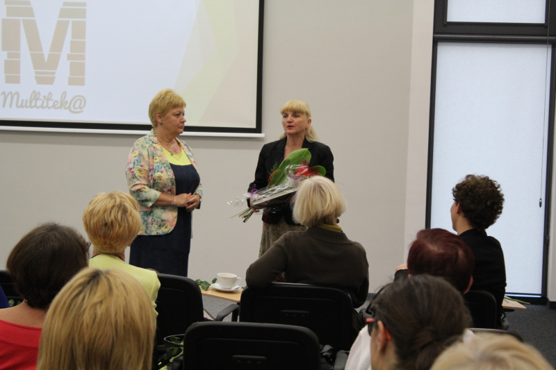 Spotkanie rozpoczęła i poprowadziła pani dyrektor „Multiteki” Małgorzata Wojtyra. Następnie pani wiceburmistrz Prusic Kazimiera Rusin złożyła serdeczne życzenia wszystkim bibliotekarzom z okazji Dnia Bibliotekarza, który przypadł 8 maja. Wszystkim zebranym zostały wręczone czerwone róże. Głos zabrała również pani Jolanta Ubowska – zastępca dyrektora Dolnośląskiej Biblioteki Publicznej we Wrocławiu oraz Halina Muszak – dyrektor Obornickiego Ośrodka Kultury. Wszyscy goście byli pod wrażeniem nowoczesności oraz wyposażenia naszej biblioteki. Interesującym punktem konferencji była prezentacja, która dotyczyła działalności „Multiteki”. Dzięki temu można było przekonać się jak aktywnie ona funkcjonuje i wiele się tu dzieje. Na zakończenie goście zostali zaproszeni na pyszny poczęstunek, mogli porozmawiać oraz wymienić się doświadczeniami.