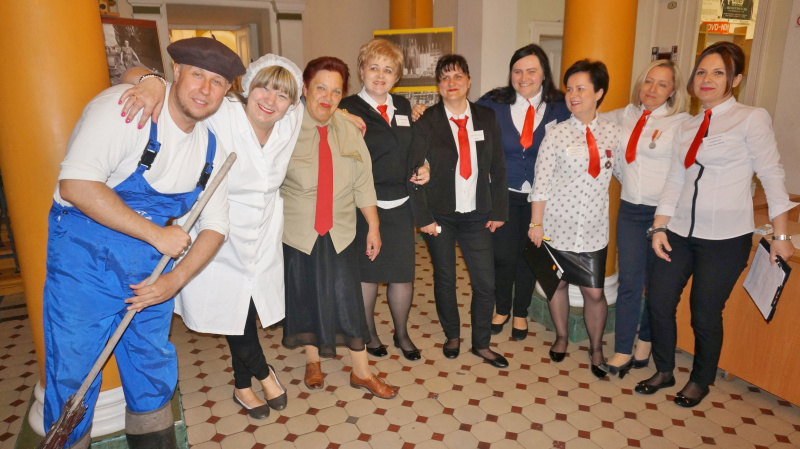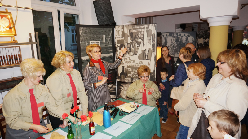Odsłona pierwsza Nocy w Książnicy to….karnie czekająca kolejka chętnych do zwiedzania, bo czyż w PRL-u najwięcej czasu nie zabierały obywatelom kolejki? Nikt jednak nie miał czasu się nudzić. Kolejkowicze byli odpytywani z imion szwagrów i ciotek, zastanawiali się „za czym kolejka ta stoi”. Na każdą trzydziestoosobową grupę płocczan czekał przewodnik, który opowiadając historię gmachu poprowadził zwiedzających przez wyznaczone punkty. Były więc fragmenty Polskiej Kroniki Filmowej, wystawa archiwalnych zdjęć biblioteki, zebrane w wypożyczalni głównej peerelowskie odznaczenia, stary telefon, maszyna do pisania itp., można było też posłuchać muzyki ze starego gramofonu. Jeszcze tylko konkurs na okładanie książek w szary papier na czas i kolejny punkt zwiedzania czyli gabinet I sekretarza Komitetu. Tu towarzyszki-aktywistki przydzielały talony na lokal mieszkalny, rozdawały książki spod lady.