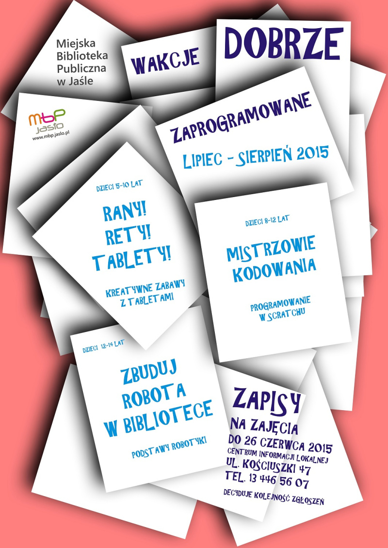 Centrum Informacji Lokalnej Miejskiej Biblioteki Publicznej w Jaśle zaprasza dzieci w wieku 5-14 lat na cykl bezpłatnych zajęć Wakacje dobrze zaprogramowane. W ramach cyklu proponujemy trzy rodzaje aktywności: Mistrzowie Kodowania (1 - 17 lipca), Zbuduj robota w Bibliotece (7 - 21 sierpnia), Rany! Rety! Tablety! (6 lipca - 17 sierpnia).