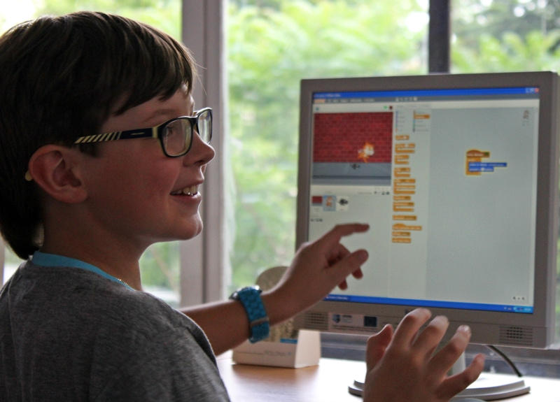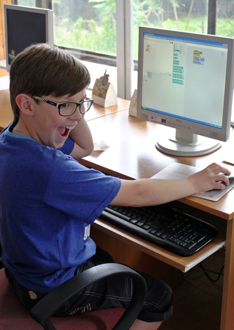 Za nami dwa pierwsze zajęcia 30 czerwca i 1 lipca br. Podczas pierwszych spotkań uczestnicy zastanawiali się czym jest kodowanie, jak powstają gry i skąd komputer wie jakie polecenie wykonać. Komputer musi znać kod – powiedział Kuba. Każde polecenie to jakiś kod, który komputer rozszyfrowuje – dodał. Mali programiści sprawdzili jakie elementy są koniecznie aby powstała gra i poznali program Scratch.