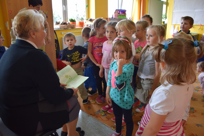 Maria Tomasik wraz z pracownikami GBP odwiedziła także Oddział Przedszkolny z Zespołu Szkół w Warzycach. Najmłodsi chętnie odpowiadali na wszystkie pytania Gościa. Opowiadali o swoich ukochanych zwierzątkach oraz babciach i dziadkach. Babcia Marysia odczytała wiele wspaniałych rymowanek, które zostały nagrodzone gromkimi brawami. Przy okazji dzieci uczyły się wiersza Mój dziadek.