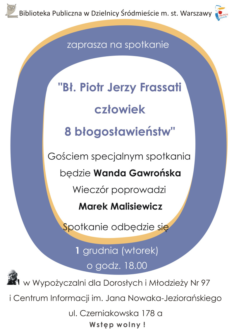 Gościem specjalnym spotkania 1 grudnia (wtorek) 2015 r. o godz. 18.00 w Centrum Informacji im. Jana Nowaka-Jeziorańskiego przy ulicy Czerniakowskiej 178 A będzie Wanda Gawrońska - córka Włoszki Luciany Gawrońskiej z domu Frassati i Jana Gawrońskiego polskiego dyplomaty. Siostrzenica bł. Piotra Jerzego Frassatiego