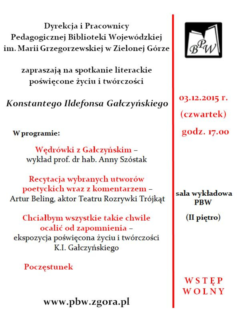 Pedagogiczna Biblioteka Wojewódzka im. Marii Grzegorzewskiej w Zielonej Górze serdecznie zaprasza na spotkanie literackie, poświęcone życiu i twórczości Konstantego Ildefonsa Gałczyńskiego, które odbędzie się 3 grudnia 2015 r. o godzinie 17.00 w sali konferencyjnej Biblioteki (nr 214, II piętro) przy al. Wojska Polskiego 9.