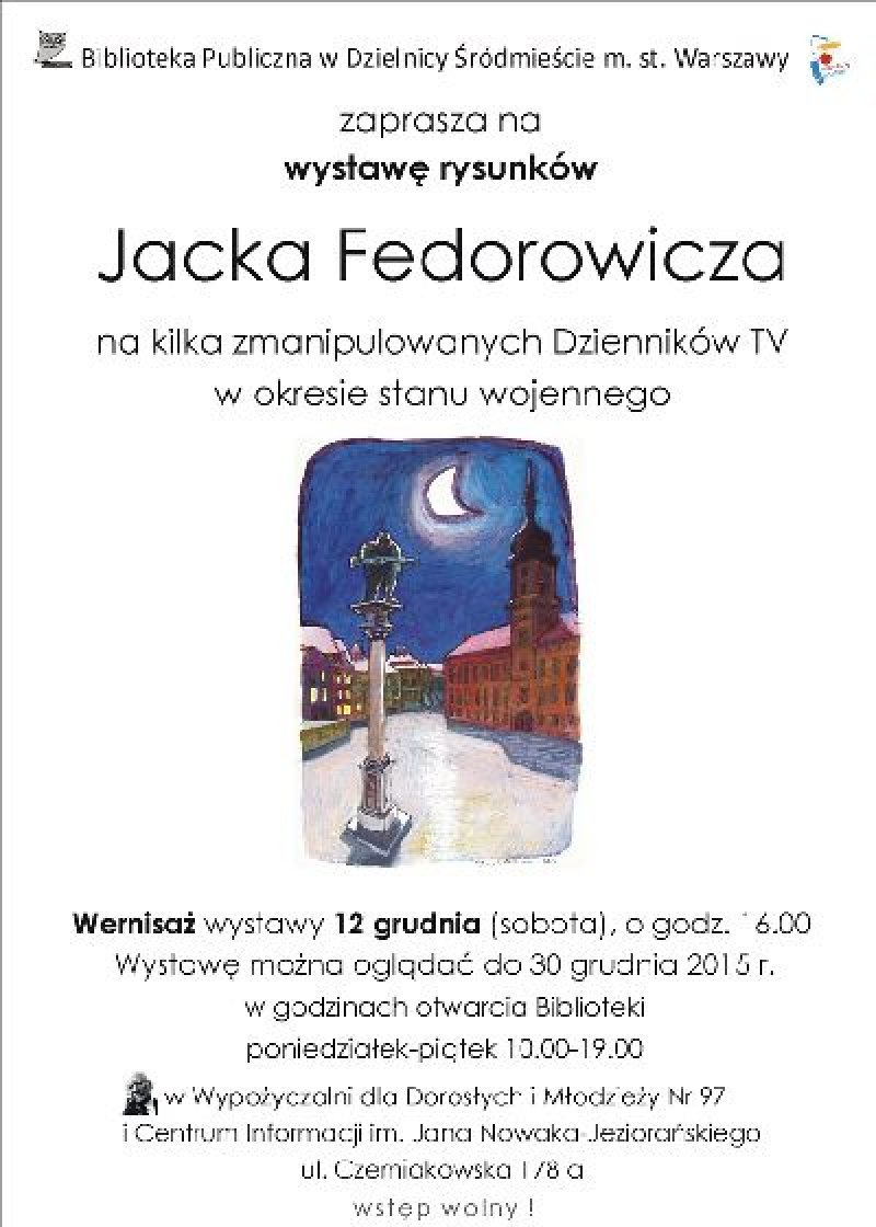 Wystawę prac Jacka Jana Fedorowicza – satyryka i aktora z wykształcenia artystę malarza, można obejrzeć w Centrum Informacji im. Jana Nowaka-Jeziorańskiego przy ulicy Czerniakowskiej 178 A do 30 grudnia od poniedziałku do piątku w godz. 10.00 - 19.00. Wernisaż wystawy odbędzie się12 grudnia(sobota) o godz.16.00