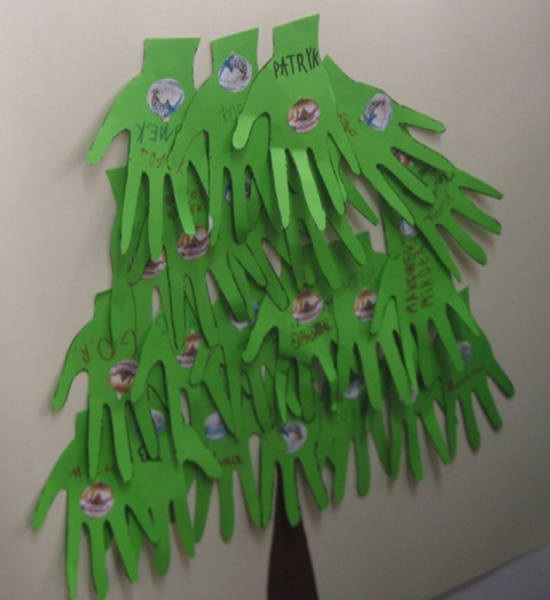 Aby dorównać pomysłom Mikołajka i jego przyjaciół uczniowie wykonali oryginalną choinkę z zielonych dłoni. Na koniec sprawdzili zawartość worka z prezentami.